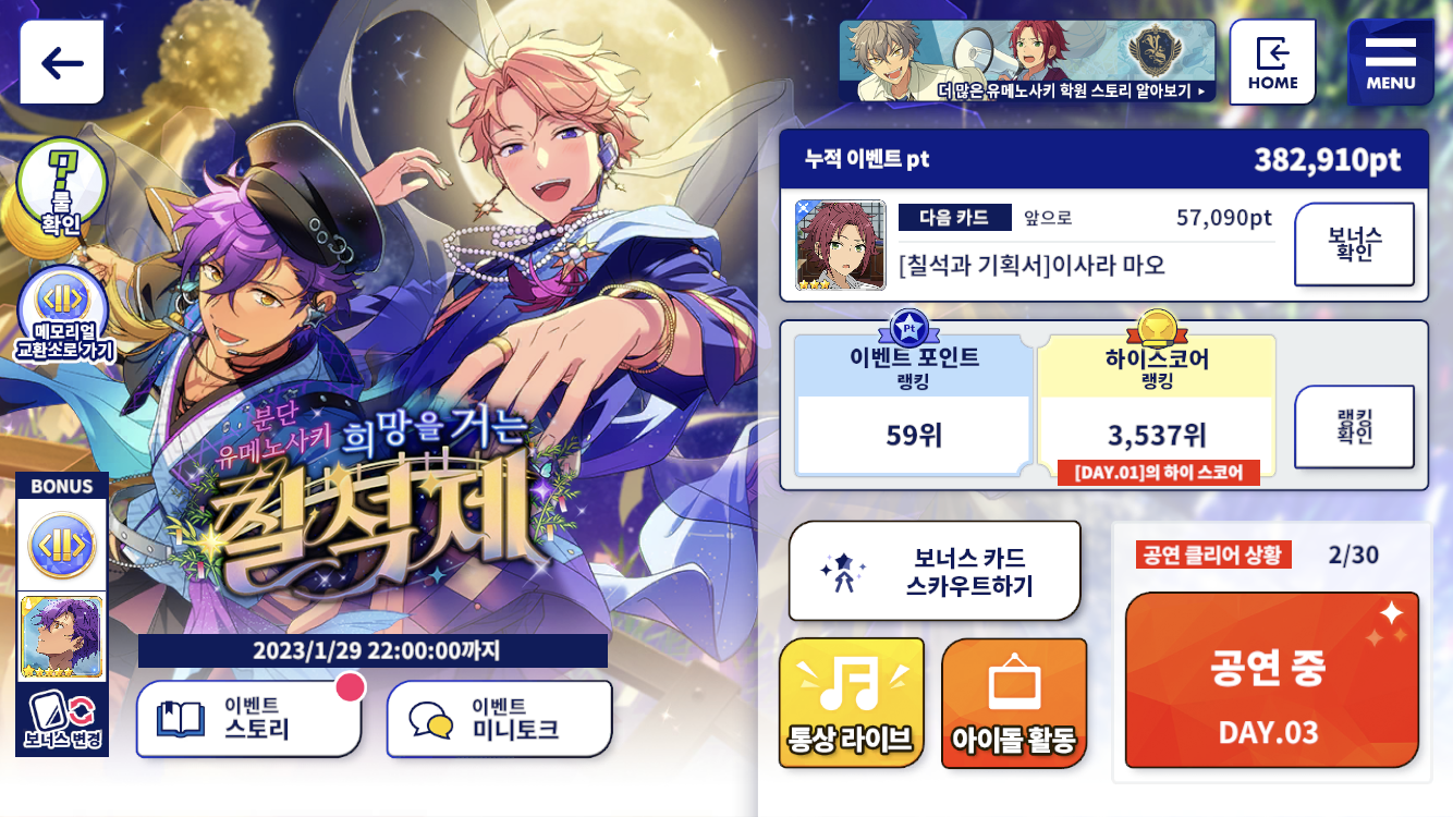 여하튼 정말 기대되는 이벤트가 하나 있었는데 첫번째는 Adonis Hako(금지된 비)/ 두번째는 Adonis Tour(칠석)/ 세번째는 Yuzuru Hako(Halloween)였습니다!