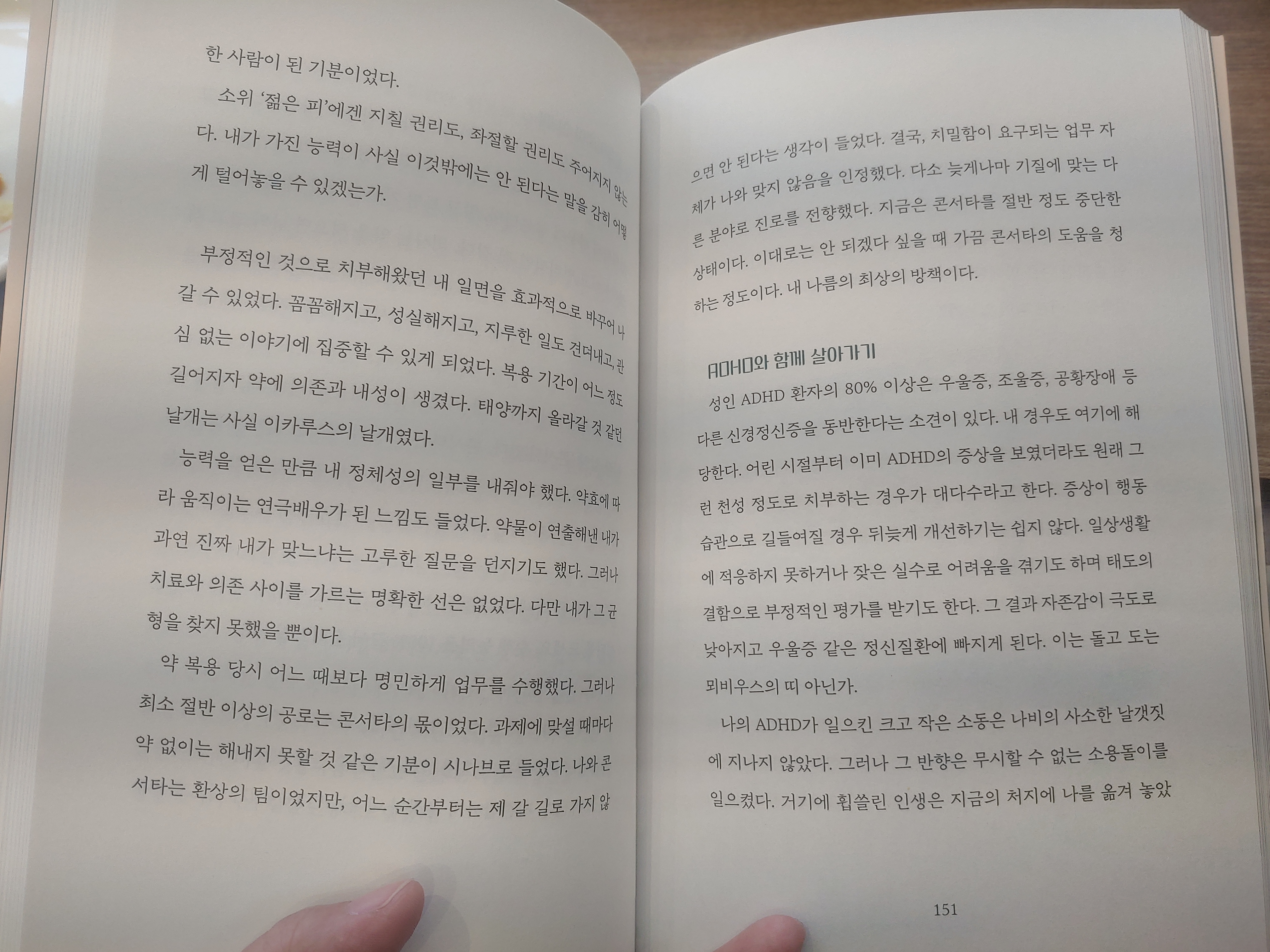 저자는 나중에 ADHD가 있다는 사실을 알게 되었고, 약을 복용하던 중 콘서타를 복용한 덕분에 머리가 맑아지고 일에 집중하는 데 확실히 도움이 되었다고 합니다. 꼼꼼하게 마무리할 수 있는 민첩성을 갖게 되었는지 궁금합니다. 그런 극적인 변화를 느끼는 게 무서웠다.