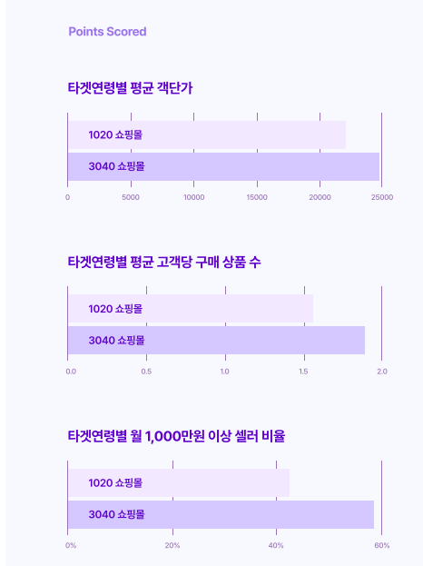 전체적으로 3040을 타깃으로 한 쇼핑몰이 단가가 높았고 고객 1인당 구매 상품수도 많았다.