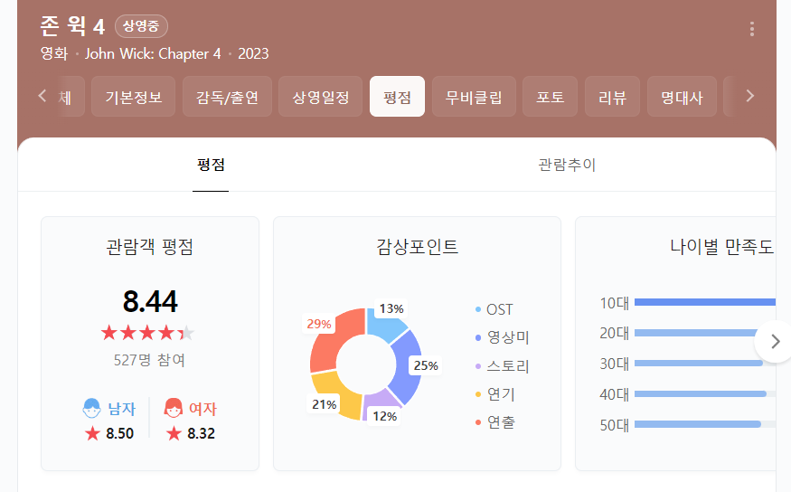 1, 2, 3의 배경에 대한 이해가 없어서 보기가 상당히 불편했습니다… 주인공을 죽이려는 사람들은 왜 주인공이 어떤 사람인지… 그것을 이해하지 못하고 주인공은 이미 늙어버린 키아누 리브스다. ..