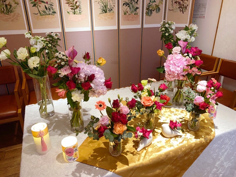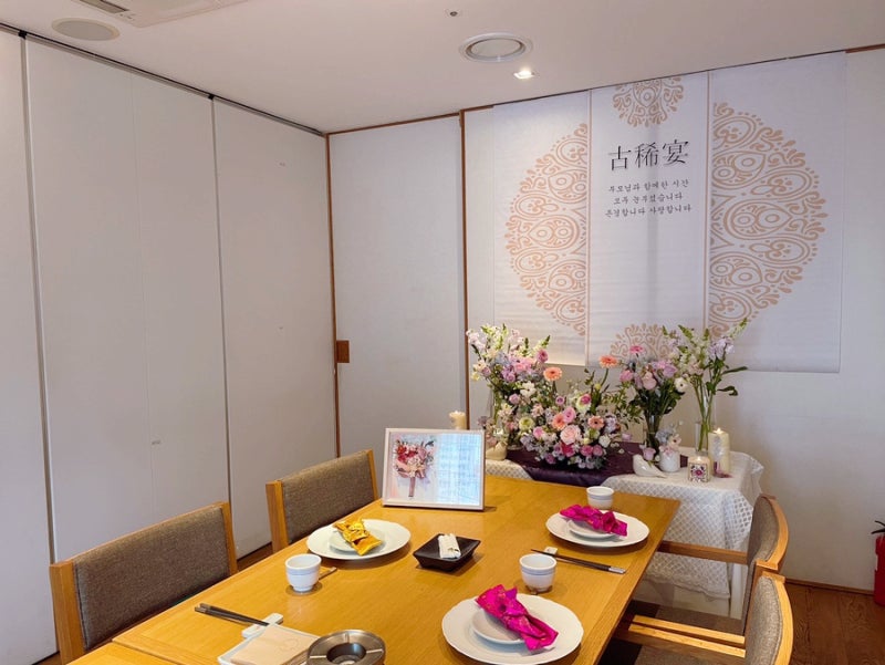 처음에는 무엇을 보여줄지 고민하다가 결국 고희연의 흰색 바탕 현수막을 선택했고, 그가 원했던 것은 분홍색과 흰색의 꽃장식이었다.