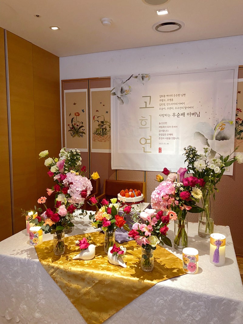 오래 보아도 늙지 않는 꽃을 컨셉으로 고희연의 품격을 연출했습니다.