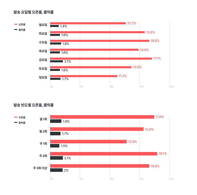 뉴스레터 오픈율이 가장 높은 요일은 금요일이며, 구독자는 주 2회 발송을 가장 선호합니다.
