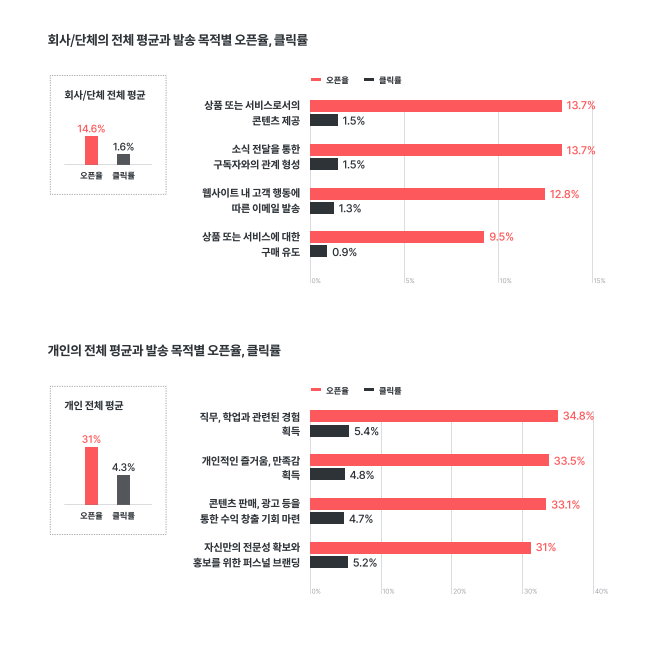 발신자가 뉴스레터를 운영하면서 중요하게 생각하는 요소 중 하나는 ‘오픈율'(구독자 대비 뉴스레터를 열어본 사람의 비율)이다. 기업의 경우 콘텐츠를 상품이나 서비스로 제공하거나 뉴스 전달을 통해 구독자와 관계를 형성하는 경우가 가장 높은 오픈율(13.7%)로 나타났다. 개인의 경우 업무나 학업과 관련된 경험을 알 수 있는 경우가 34.8%로 가장 높았다.