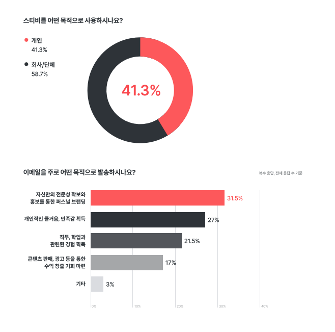 먼저 뉴스레터를 이용하는 이용자의 비율은 개인보다 기업과 단체에서 더 높았다. 그러나 개인의 비율(41%)은 전체에 비해 적지 않다. 또한 대부분의 이용자들은 이메일 발송의 주요 목적으로 ‘홍보를 통한 자신의 전문성 확보 및 퍼스널 브랜딩’을 꼽았다. 궁극적으로 뉴스레터를 통해 하나의 주제에 대한 정보와 뉴스를 전달하면서 자신만의 특화된 퍼스널 브랜딩을 구축하고 싶은 사용자많다는 것을 알 수 있었습니다